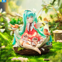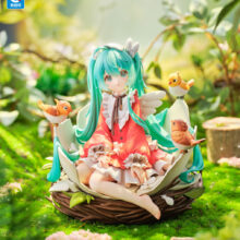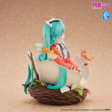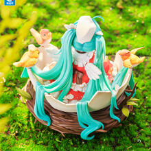 鳥の巣と割れた卵殻の中にちょこんと座るミクさんの姿を、ヴィネット風に構成しました。衣装には背景の木漏れ日を思わせる柔らかな色合いを施し、髪の透明感や爪先の輝きなど、細部まで丁寧に彩色しています。