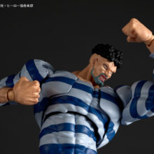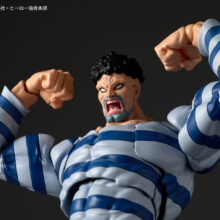 縞の囚人服に包まれたマッチョボディに、アフロ&割れた顎の厳つい容貌も 立体化! 山口勝久の総指揮による独自の可動で、肉弾戦スタイルを幅広く表現することができます。 囚人の証である右足首の鉄球は、脚パーツの交換で外した状態も再現。