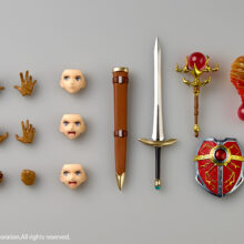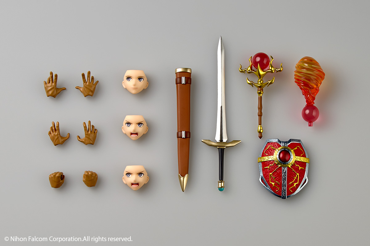 独自開発の可動ジョイントを各関節に配し、スマートなプロポーションを崩さずに幅広いアクションポーズが可能。剣は鞘への収納、杖はエフェクト付きの交換パーツで「ファイヤー」の魔法を表現できるギミックを搭載しています。